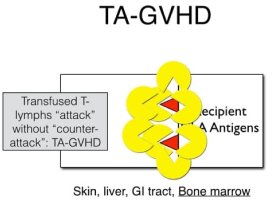 TA-GVHD is extremely rare and transfused patients present with fever, rash and diarrhoea commencing 1-2 weeks post-transfusion. Laboratory findings include pancytopenia and liver function abnormalities.